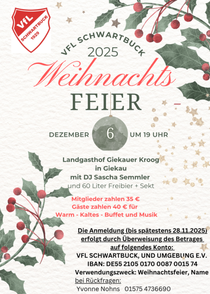 | 06.12.2025 | Weihnachtsfeier VfL | 19.00 Uhr | im Giekauer Kroog |